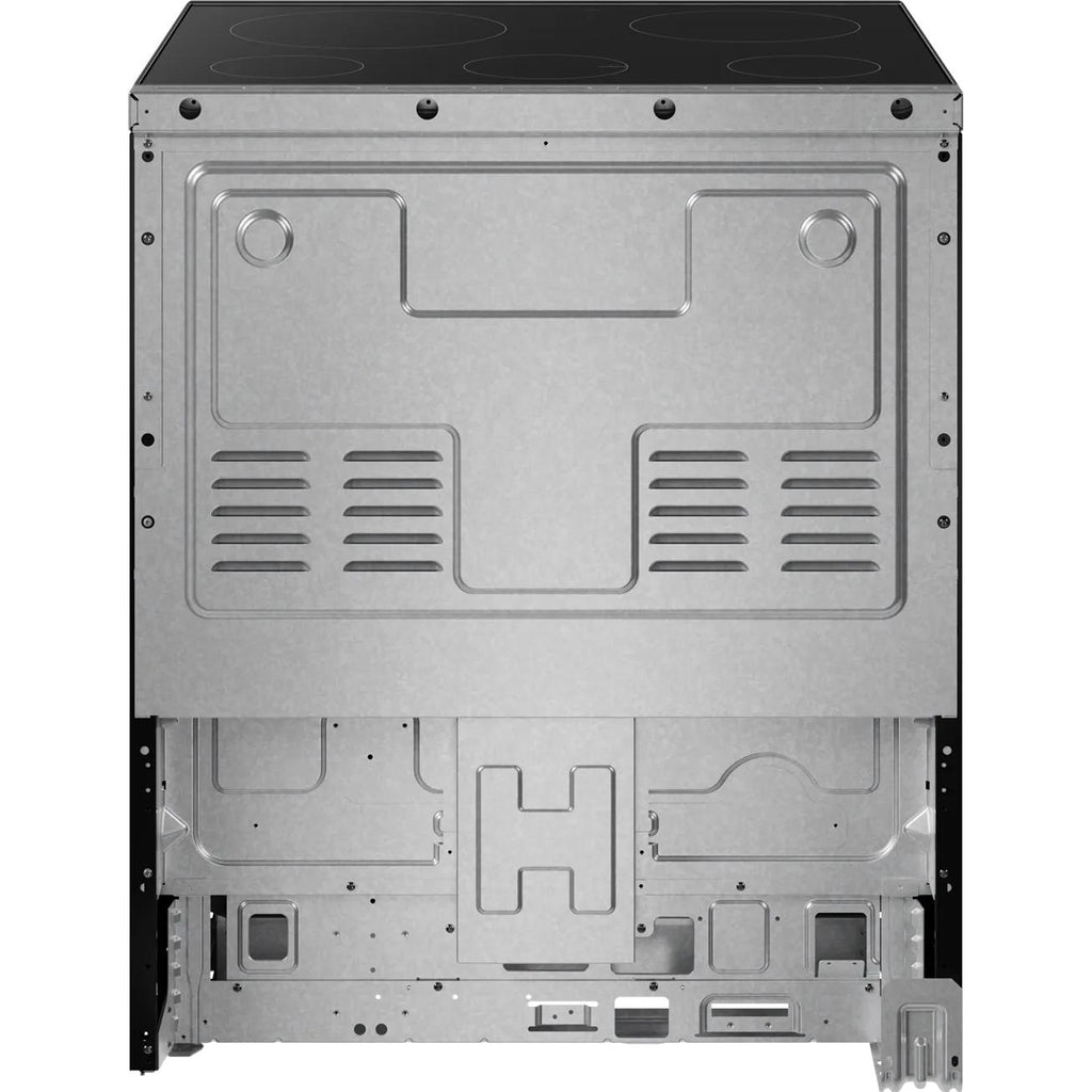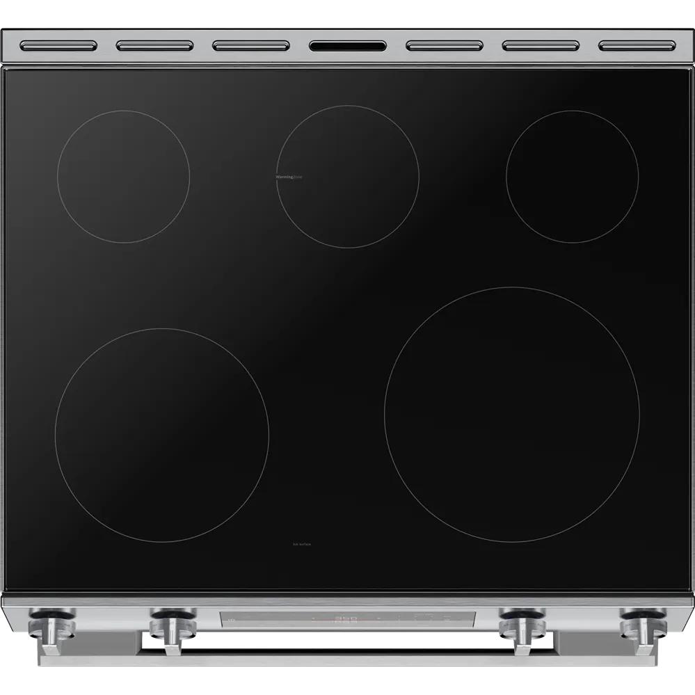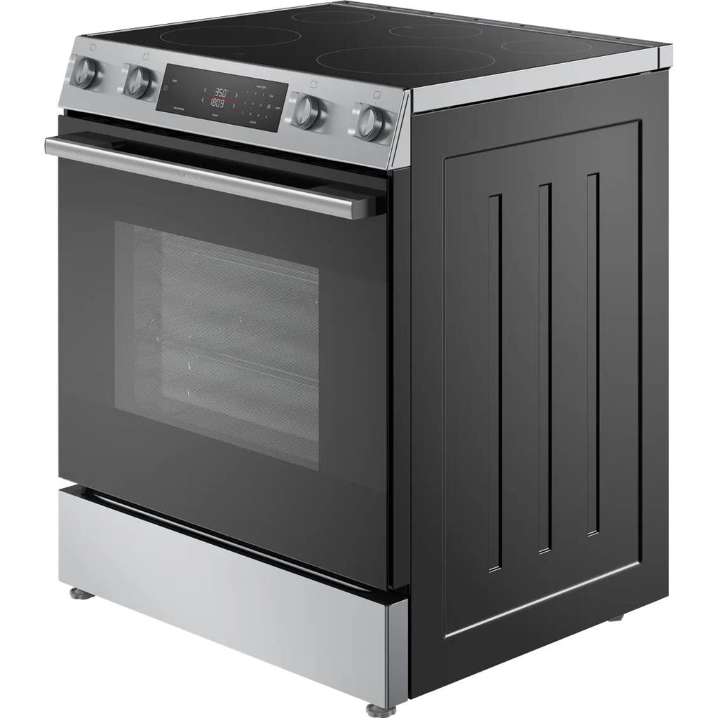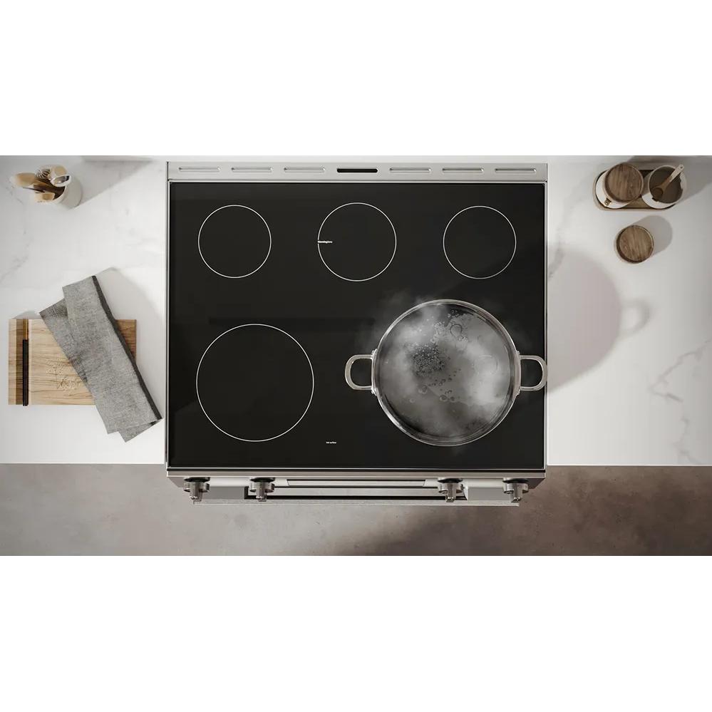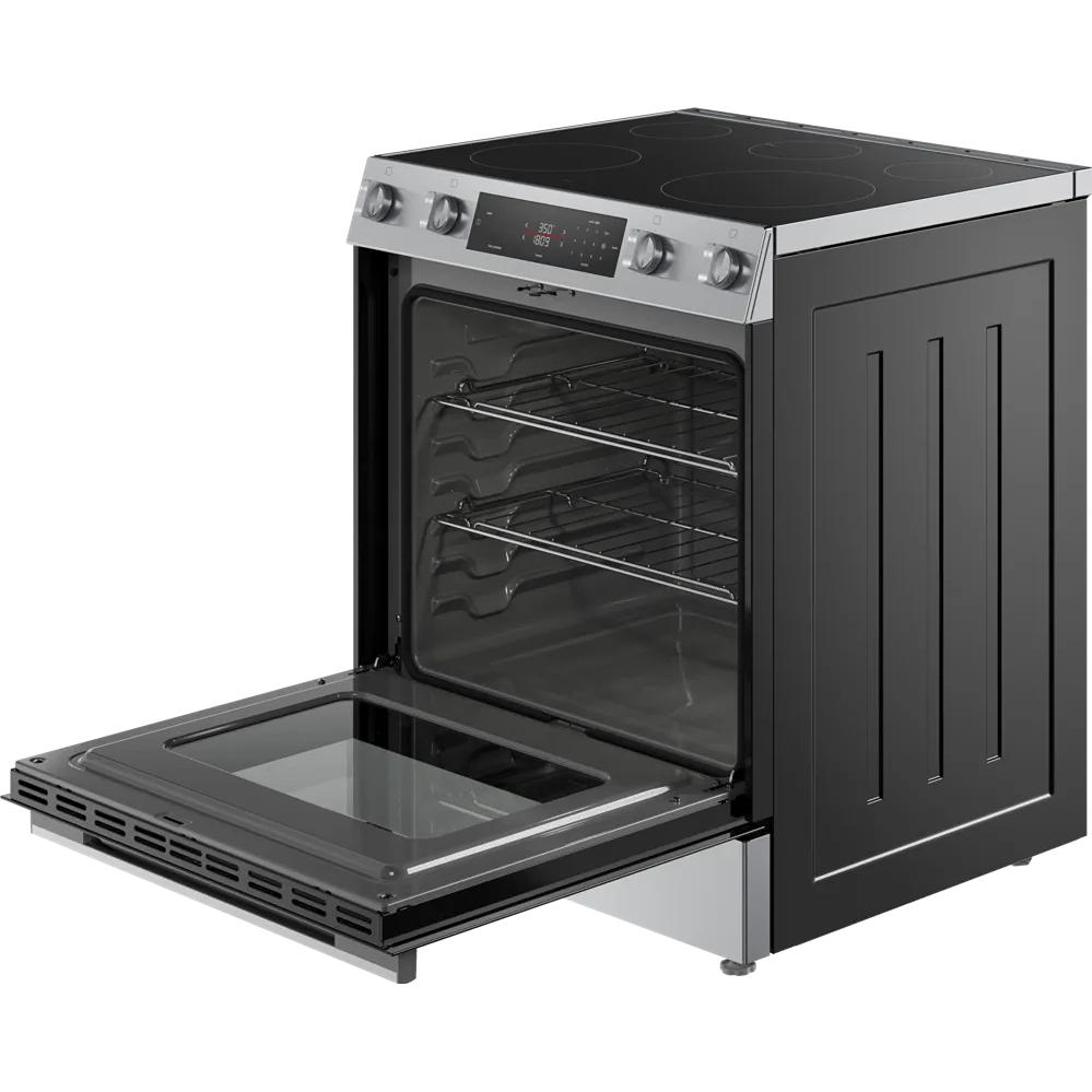 The slide-in design can replace a freestanding range cutout and slides back against the wall for a sleek built-in look.