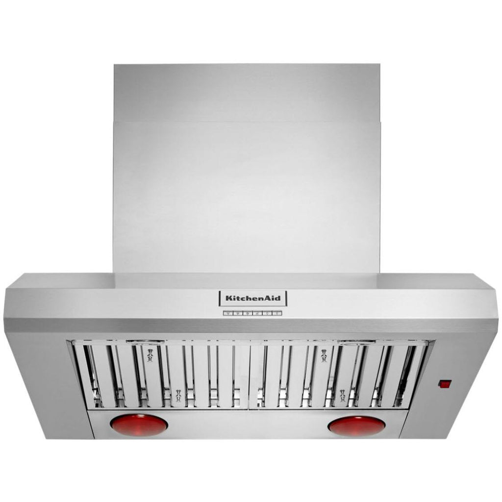 Equip your kitchen with a powerful 36-inch wall-mount canopy range hood designed to pair with 36-inch KitchenAid® Commercial-Style Ranges and... Equip your kitchen with a powerful 36-inch wall-mount canopy range hood designed to pair with 36-inch KitchenAid® Commercial-Style Ranges and Rangetops. A 90,000 BTU rating allows this vent hood to keep up with high-heat cooking on multiple burners. Two food warming heat lamps hold cooked items at serving temperature for up to an hour while you finish other dishes. View more