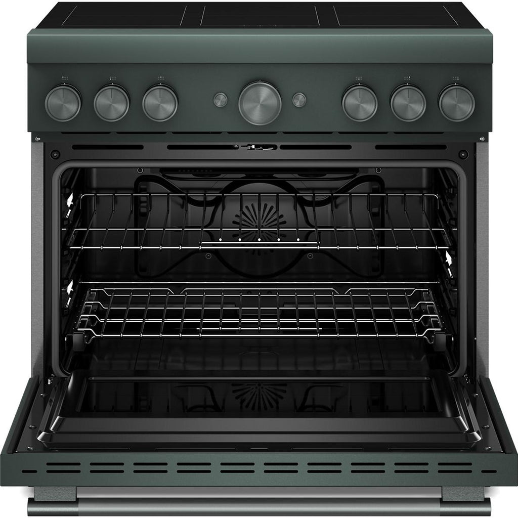 This KitchenAid® 5.1 cu. ft. 36-inch 6-Element Induction Freestanding Commercial-Style Range combines the precision of induction with the power of... This KitchenAid® 5.1 cu. ft. 36-inch 6-Element Induction Freestanding Commercial-Style Range combines the precision of induction with the power of Air Fry. Sensor-induction cooktop generates heat directly within cookware, and the oven features Even-Heat™ True Convection plus air fry mode that aids in crisping and browning. View more