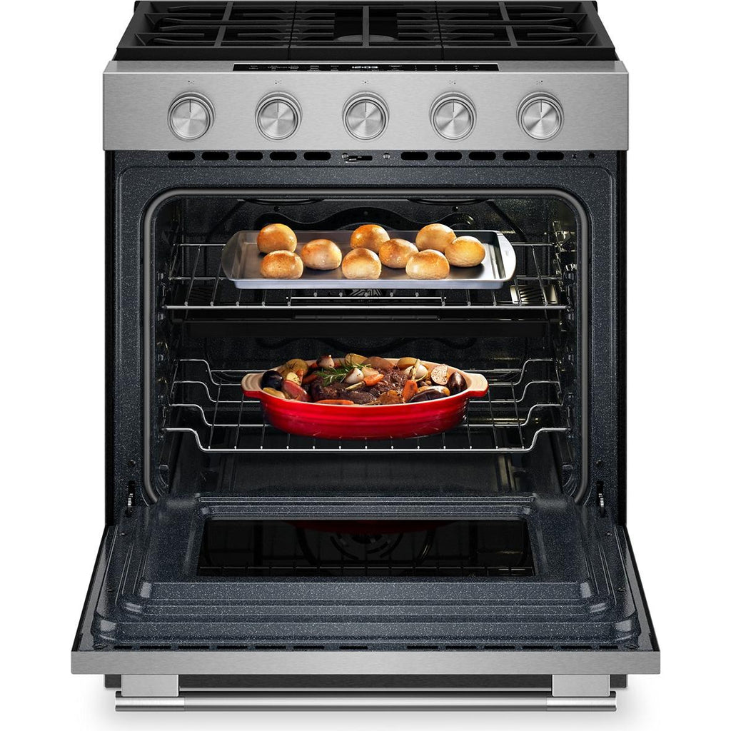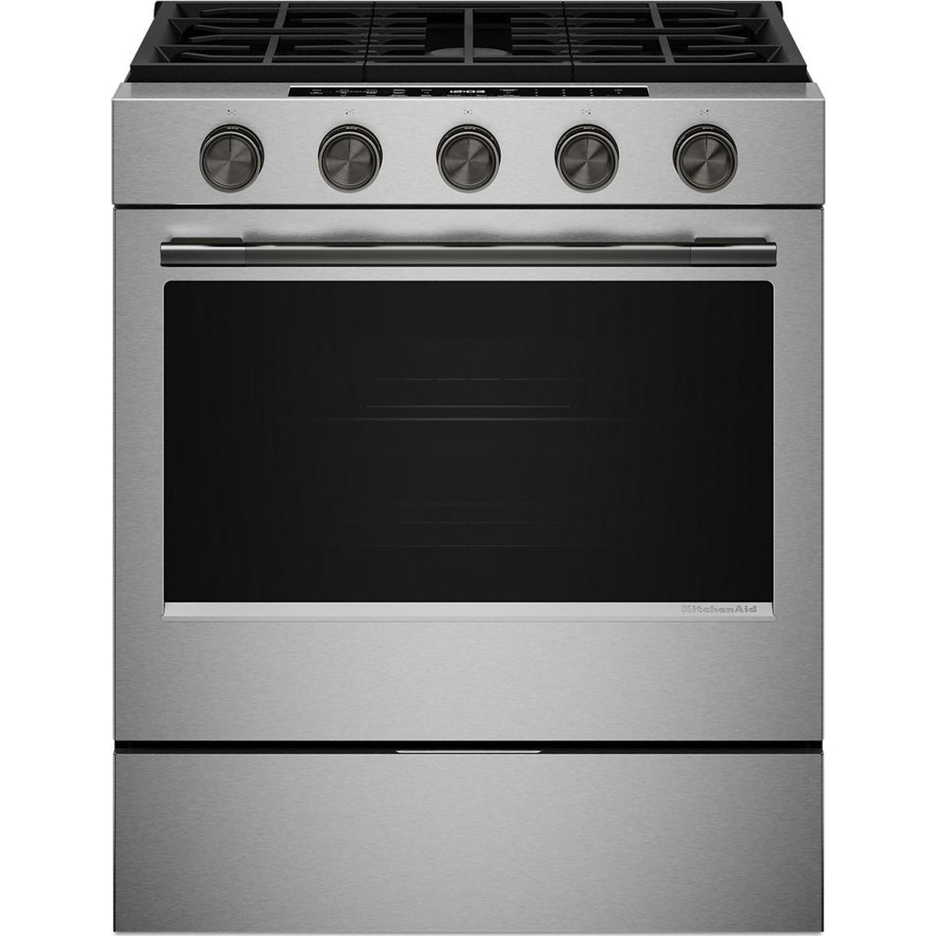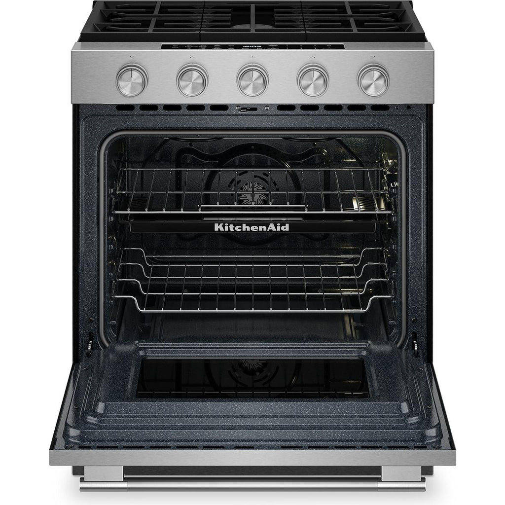 KitchenAid 30-inch Smart Slide-in Gas Range with Convection Cooking Modes and 2-in-1 Burner KSGS530SPS