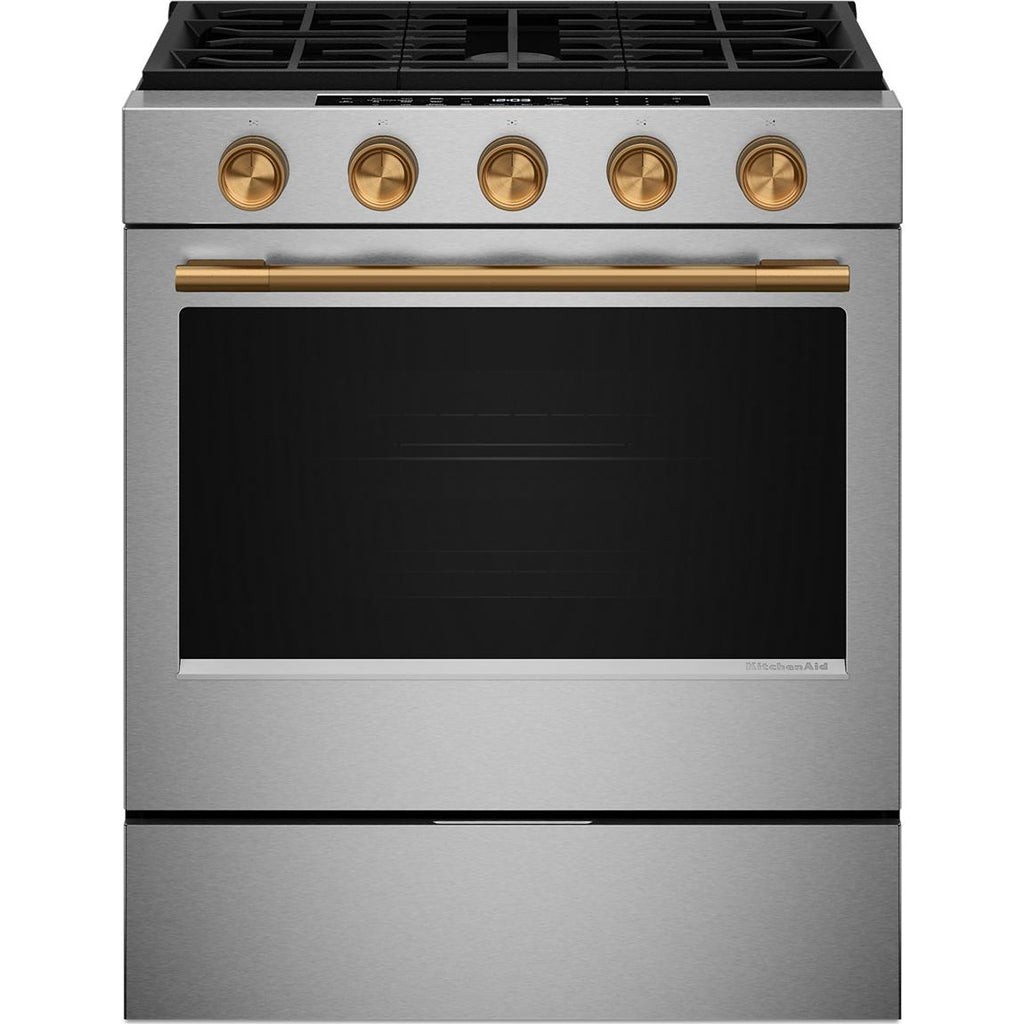 KitchenAid 5.0 Cu. Ft. Smart Slide-in Gas Range with Convection Cooking Modes and 2-in-1 Burner. Enjoy a range of possibilities... KitchenAid 5.0 Cu. Ft. Smart Slide-in Gas Range with Convection Cooking Modes and 2-in-1 Burner. Enjoy a range of possibilities with our most powerful KitchenAid 30-inch Gas Range available, featuring the industry’s most powerful and largest 2-in-1 burner for an unparalleled and versatile cooking experience. Convection Cooking Modes help you get consistent results with optimal temperatures. A Steam Bake mode works with the included steam rack to provide additional moisture during baking, so you can enjoy Basque cheesecake and other delicious desserts. The range is designed to be personalized with a curated palette of exterior finishes and mixed metal hardware. It’s also a Wi-Fi-enabled Smart Appliance model with smart features and mobile app experience. View more