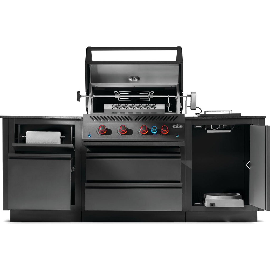 • The wing-shaped OASIS™ 300 Modular Island Kit with a full-sized, 700 Series 32-inch gas grill head
